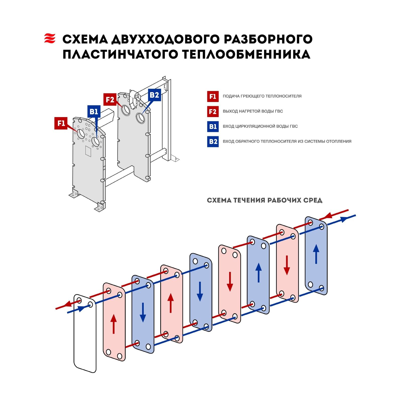 Пластинчатый теплообменник (ПТО) — это пакет тонких рифлёных пластин с прокладками или пайкой, по каналам которых потоки идут навстречу друг другу (противоток). Такая геометрия создаёт турбулентность, ускоряет теплоотдачу и уменьшает габариты при той же мощности.Типы ПТО